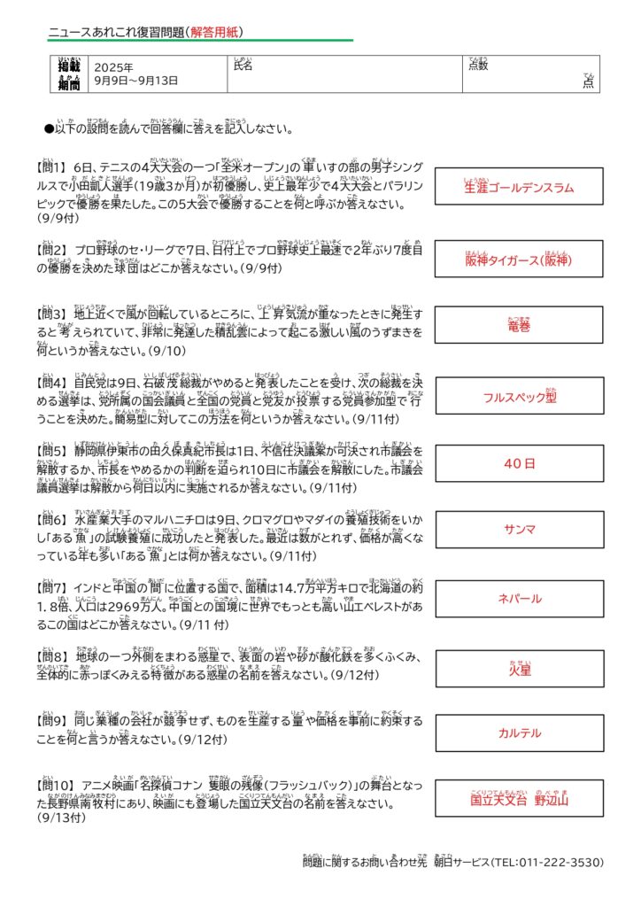 親御さんの前でお子様が『ニュースあれこれ』を音読をして、きちんと読めたら親御さんはお子様を褒めてあげましょう。(親御さんは家事や仕事をしながらでも◎)読めなかったり分からない言葉があれば、辞書やネットなどで調べましょう。毎日出来るだけニュースについて親子やご家族で話をしたり、クイズなどを出し合ったりするようにしましょう!お子様の成長を実感できるひと時にもなりますよ!