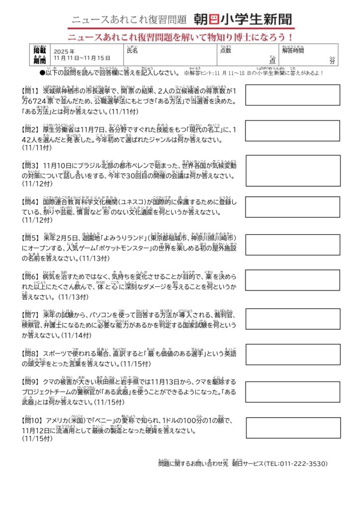 親子で時事問題!【朝小ニュースあれこれ復習問題(11/11~11/15)】★毎週月曜更新