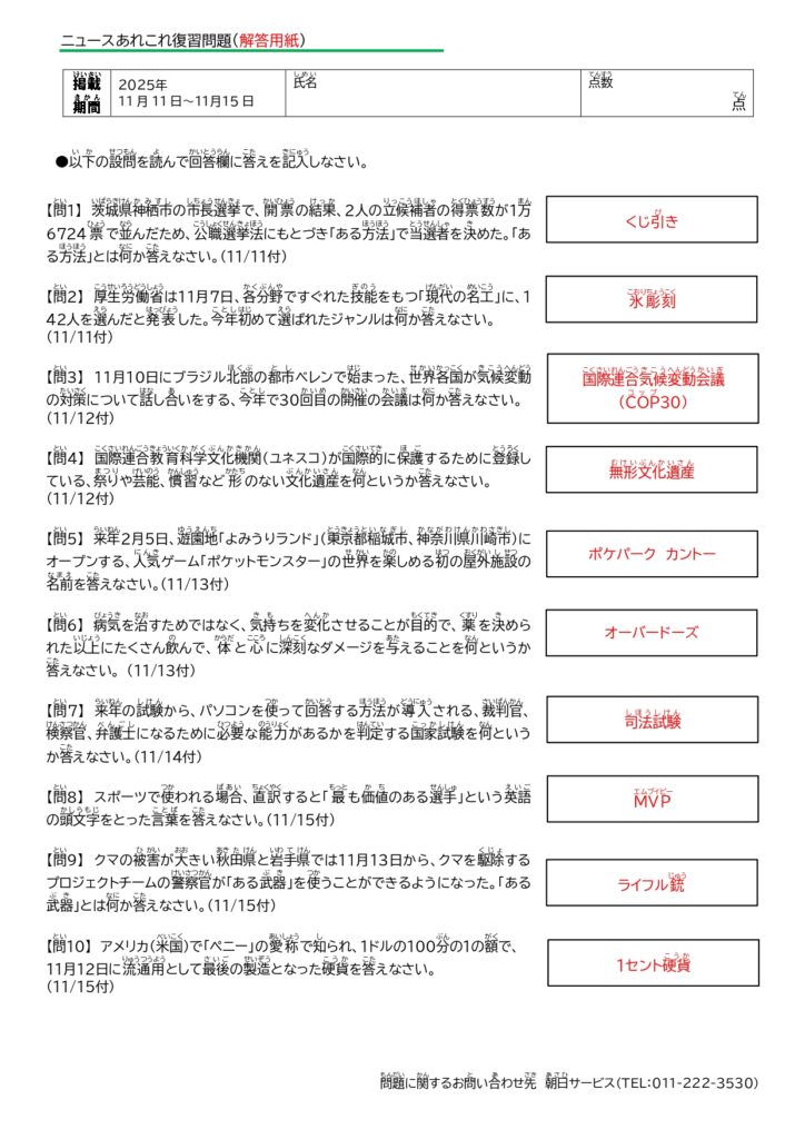 親子で時事問題!【朝小ニュースあれこれ復習問題(11/11~11/15)】★毎週月曜更新